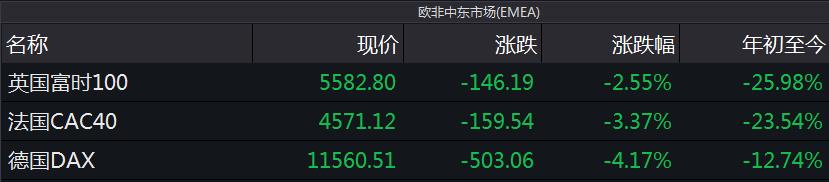 歐洲股市方面,歐洲三大股指大幅下跌,英國富時100指數報5582.80點,跌146.19點,跌幅2.55%;法國CAC40指數報4571.12點,跌159.54點,跌幅3.37%;德國DAX指數報11560.51點,跌503.06點,跌幅4.17%。