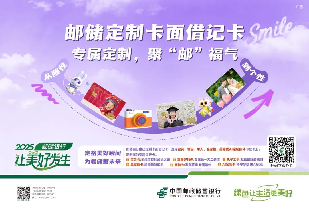 生活里的珍貴瞬間,都值得被珍藏。郵儲銀行定制卡面借記卡,讓您的銀行卡成為專屬紀念。無論是寶貝的笑顏、獨一無二的自己、甜蜜的合影、溫馨的全家福,還是萌寵的可愛瞬間,甚至是AI創作的奇思妙想——統統可以印在卡上,讓每一次支付,都充滿儀式感!