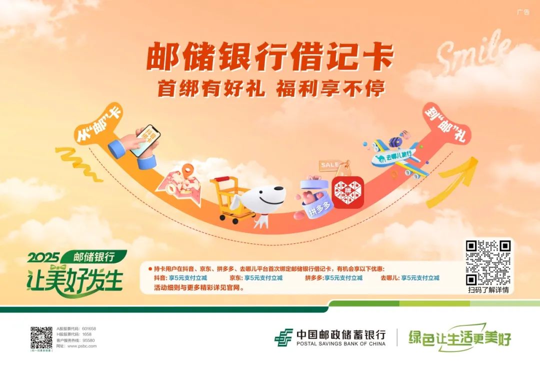 郵儲銀行借記卡持續升級用卡體驗,為持卡用戶帶來更多線上消費福利。2025年,郵儲銀行推出“首綁立減”專項活動,覆蓋抖音、京東、拼多多、去哪兒四大熱門平臺,讓用戶享受更便捷、更實惠的移動支付體驗。