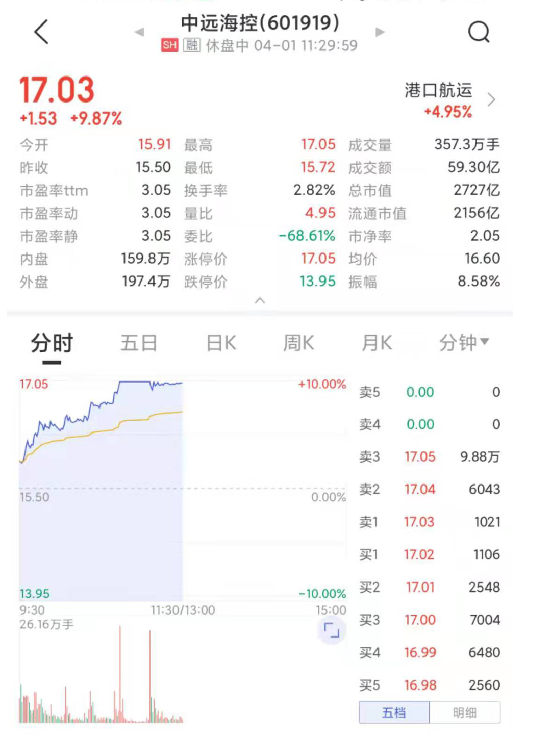 4月1日,受集裝箱運輸供求關系持續緊張消息影響,A股港口航運板塊走強,中遠海控盤中一度漲停,連云港、上港集團、重慶港、盛航股份等多股紛紛封板,南京港、日照港等上漲。