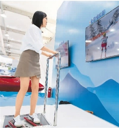 記者在冬博會北京2022冬奧組委展區體驗滑雪模擬器。人民網記者 翁奇羽攝