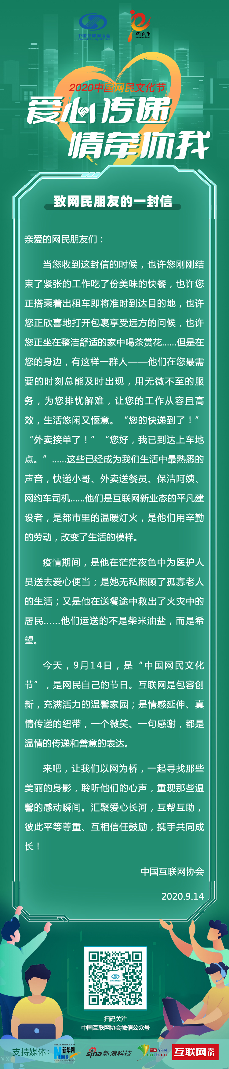 首頁 >> 財(cái)經(jīng) >> IT產(chǎn)業(yè) >> 正文9月14日,中國互聯(lián)網(wǎng)協(xié)會(huì)啟動(dòng)“2020中國網(wǎng)民文化節(jié)”活動(dòng),活動(dòng)主題為:愛心傳遞,情牽你我。