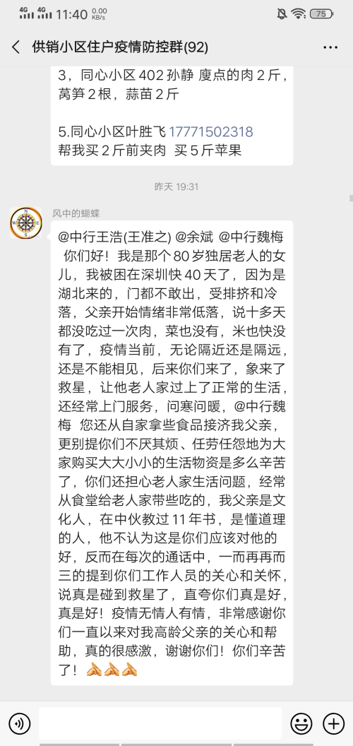 首頁 >> 財經(jīng) >> 財經(jīng)動態(tài) >> 正文咸寧網(wǎng)訊 通訊員 王浩:“疫情無情人有情,非常感謝你們一直以來對我高齡父親的關(guān)心和幫助,真的很感激,謝謝你們!你們辛苦了!”3月5日,赤壁供銷小區(qū)80歲獨(dú)居老人的女兒給中國銀行赤壁支行參與該小區(qū)疫情防控的工作人員發(fā)來了一段長長的感謝信。