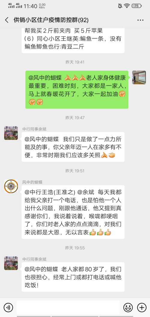 據(jù)了解,供銷小區(qū)是該行負(fù)責(zé)包保小區(qū)中的一個,有49戶159人,屬于“三無”小區(qū),居民組成復(fù)雜,管控難度大。為堅守疫情防控最后“一公里”,打贏這場疫情防控攻堅戰(zhàn),該行第一時間成立臨時黨支部,承擔(dān)起供銷小區(qū)日常值守、后勤保障、物業(yè)管理、應(yīng)急處置等工作。工作人員既要當(dāng)好排查員,又要當(dāng)好宣傳員,還要當(dāng)好服務(wù)員,對小區(qū)所有居民開展上門排查,建立微信服務(wù)群,宣傳疫情防控相關(guān)規(guī)定,幫助協(xié)調(diào)解決各種困難問題,主動幫助困難居民申請低保等,工作人員通過微信群和上門調(diào)查的方式加強(qiáng)與小區(qū)居民的互動和關(guān)愛,把小區(qū)居民當(dāng)做家人看待,患難與共,共同筑起“外防輸出,內(nèi)防輸入”的銅墻鐵壁的同時,也通過“疫情”,讓大家建立起了更深的“鄰里情”。