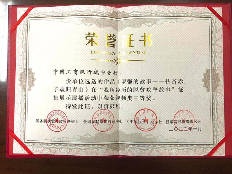 咸寧網訊(記者 葉子 通訊員 肖滿詩) 近日,從國務院扶貧辦公室傳來好消息:工行咸寧分行報送的《扶貧赤子魂歸青山——羅強的故事》視頻作品,在國務院扶貧辦公室組織的“我所經歷的脫貧攻堅故事”征集展示展播活動中榮獲視頻類三等獎,這也是湖北省金融系統工程唯一一家獲此獎項的銀行業機構。