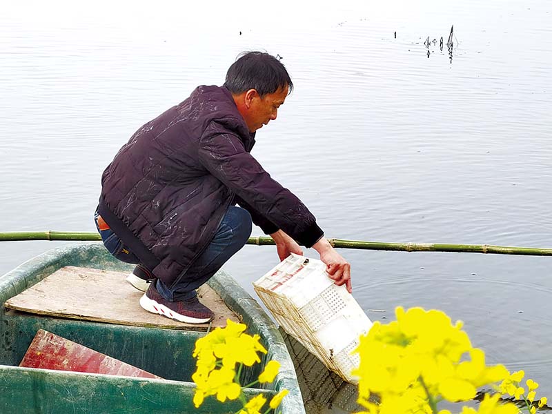 3月12日,咸安向陽湖鎮(zhèn)北嶺村1組的稻田里,連片的稻田看不到邊,田埂上到處都是一叢叢的油菜花,黃綠相間,種糧大戶吳新法蹲在一艘木船上往稻田里放蝦苗。他在根據(jù)每畝稻田里的種養(yǎng)情況,調(diào)整稻蝦的養(yǎng)殖密度。