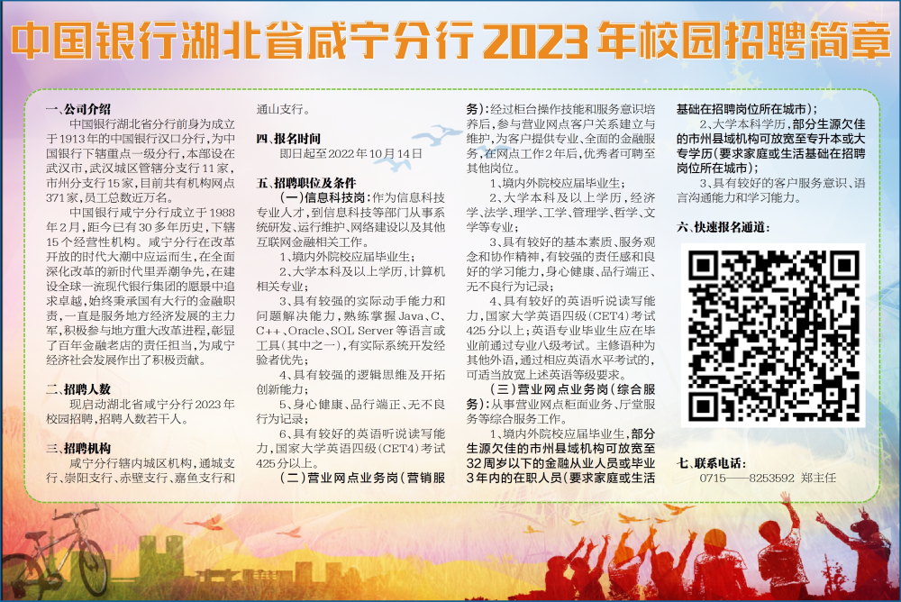現(xiàn)啟動湖北省咸寧分行2023年校園招聘,招聘人數(shù)若干人。