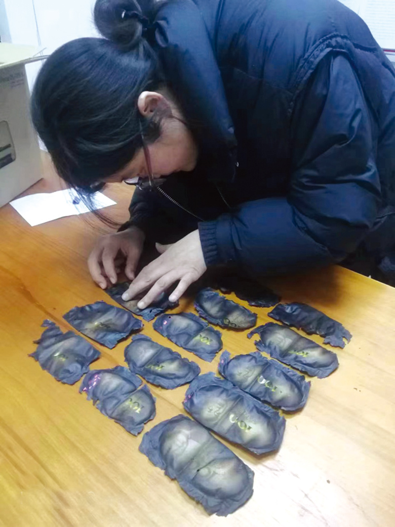 在人民銀行專業(yè)技術支持下,“火燒幣”兌換小組信心更足。用小刀、小鑷子為這堆“火燒幣”做起了“手術”。為避免二次傷害,工作人員小心翼翼的將殘損幣揭開、攤平,耐心細致地識別、分揀、剝離、修補、統(tǒng)計、復核,歷時兩天完成全部“火燒幣”的鑒定,最終為客戶兌換12400元,最大限度維護了客戶的利益。