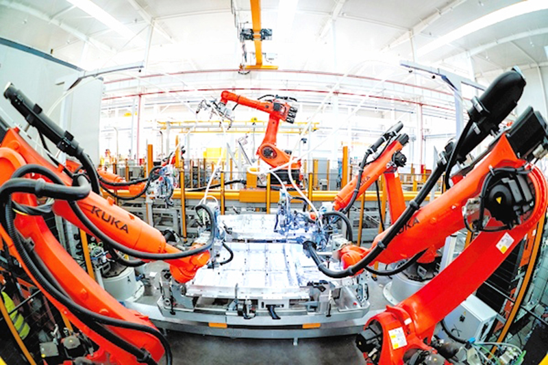 2日,位于咸安經濟開發區湖北敏實汽車零部件有限公司的智慧工廠內,數十臺工業機器人正在生產新能源汽車鋁電池盒等配件。?