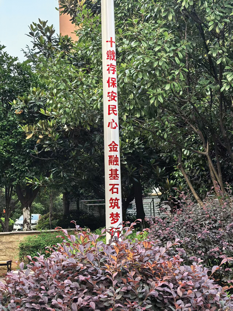 此外,小區內的路燈桿、指示牌等也化身成為宣傳載體,印制著朗朗上口、主題鮮明的標語,如“十載存保安民心,金融基石筑夢行”等,讓金融安全知識伴隨著居民的每一步。在公共休閑椅、長廊等休憩點,以及乒乓球桌、健身器材區、兒童游樂場等活力空間,居民們都可以看到生動有趣的口號和標語。這些口號將金融安全理念與健康生活、家庭歡樂場景自然融合,讓居民在輕松愉快的氛圍中學習到金融知識。