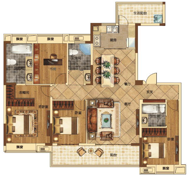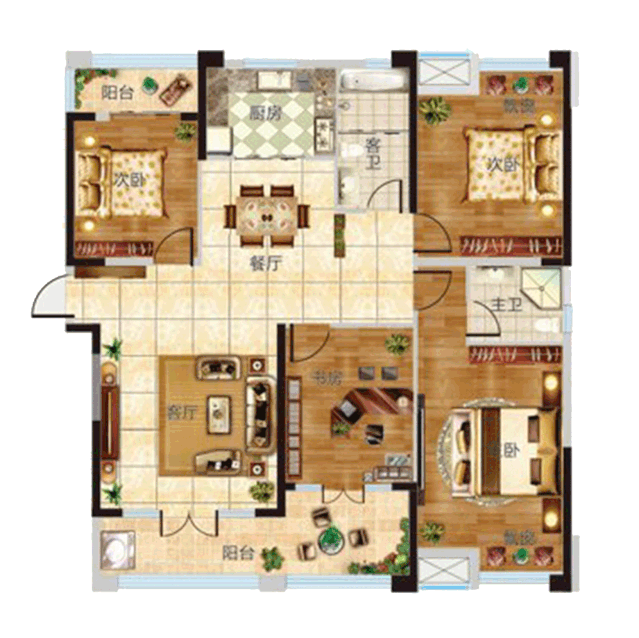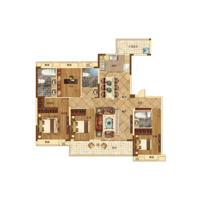 中建·咸寧之星建面約165㎡戶型實現了 四房三衛格局 ,從私密性與實際使用角度出發,在主衛與客衛之外,父母房也特別設置獨立衛生間,這樣的設計理念在整個咸寧實屬罕見。既提高了家庭成員的居住私密性,也照顧到老人日常行動的安全方便和喜靜的特點。
