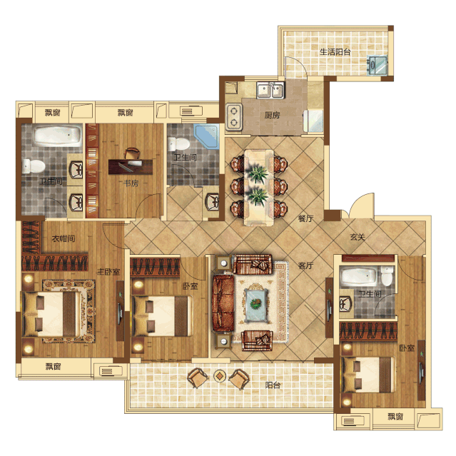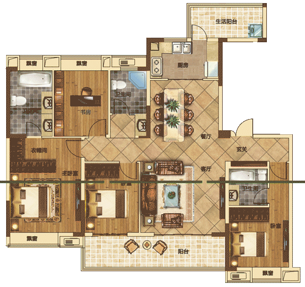 入口處的次臥套房可以容納約2.2米寬的衣柜,擺放約2米的雙人床加床頭柜,滿足日常物品的收放,大大的節省了臥室空間。另一個次臥可容納2米的整體衣柜,擺放一張1約8米的雙人床,再加一張梳妝臺、電腦桌等,滿足不同的使用要求。約3.6米朝南豪華主臥,方正實用,利用率高,可以放下2米的大床和多種家具。精心設計走入式衣帽間,左右兩邊整墻的儲物柜,滿足了主人對儲物空間的完美需求。