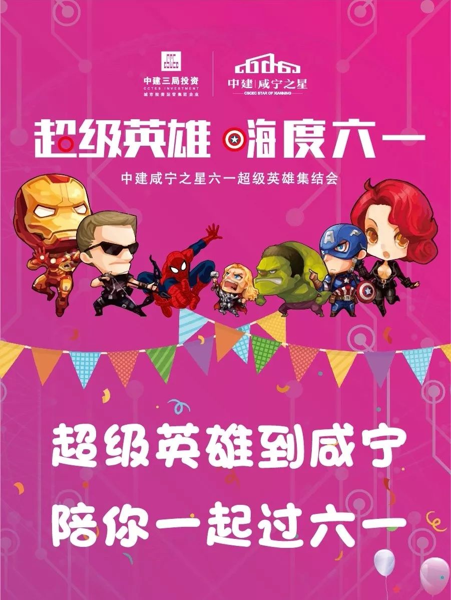 1、到訪即獲精美禮物; 2、集齊能量卡參與抽獎,即有機會獲得超級英雄送你的神秘驚喜大禮(數量有限,先到先得) 活動時間:2019年6月1日10:00—18:00 活動地址:咸寧市金桂路與旗鼓大道交會處(中建·咸寧之星營銷中心)