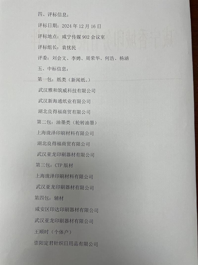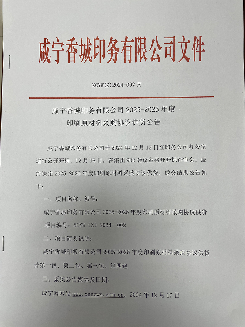 咸寧香城印務(wù)有限公司于2024年12月13日在印務(wù)公司辦公室進(jìn)行公開開標(biāo);12月16日,在集團(tuán)902會(huì)議室召開開標(biāo)評(píng)審會(huì);最終決定2025-2026年度印刷原材料采購(gòu)協(xié)議供貨,成交結(jié)果公告如下: