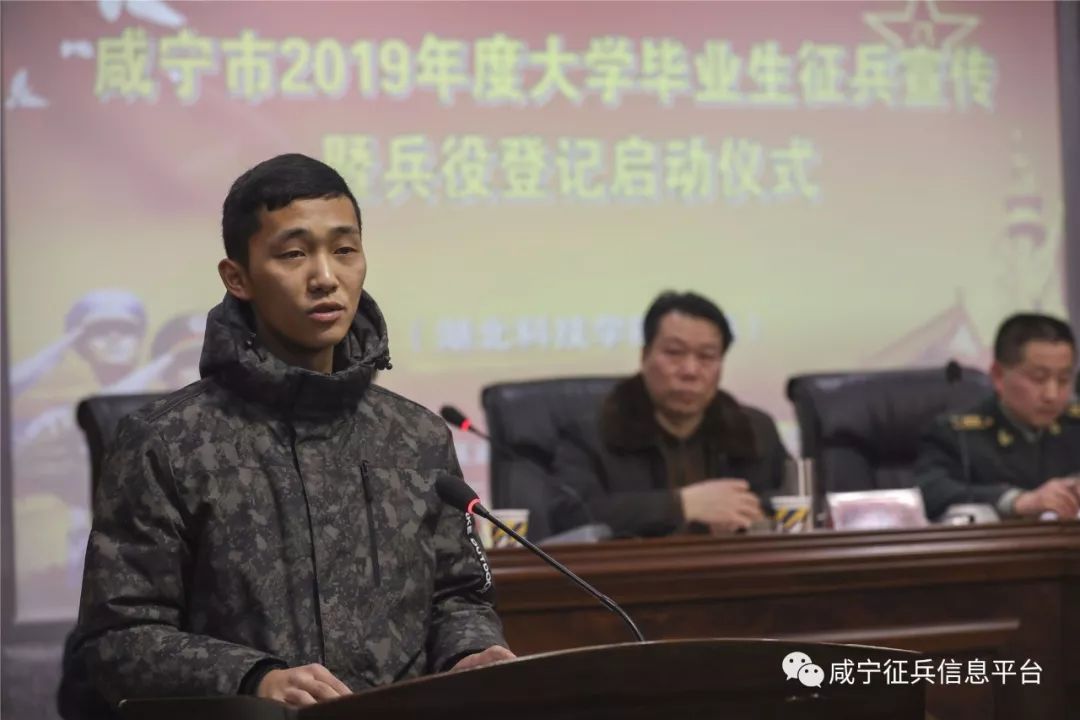 “人的青春,不只有詩和遠方,還有家國與邊關……”1月14日,在咸寧市2019年度大學畢業生征兵宣傳暨兵役登記啟動儀式上,來自湖北科技學院的大學生退役士兵方圓在講述自己經過部隊洗禮后成長的故事,號召青年學子當兵去。