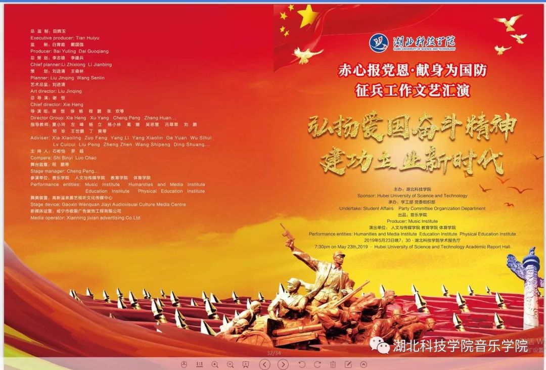 市委常委、咸寧軍分區司令員來承坦,咸寧軍分區政委衣天寶,湖北科技學院黨委書記田輝玉,市委宣傳部副部長王勝弘,咸寧軍分區副司令員田華斌,湖北科技學院副校長戴國強,咸寧軍分區動員處處長羅衛東,咸安區人武部部長陸有山,咸安區人武部政委陸勇丁及湖北科技學院學生代表1000余人共同觀看演出。