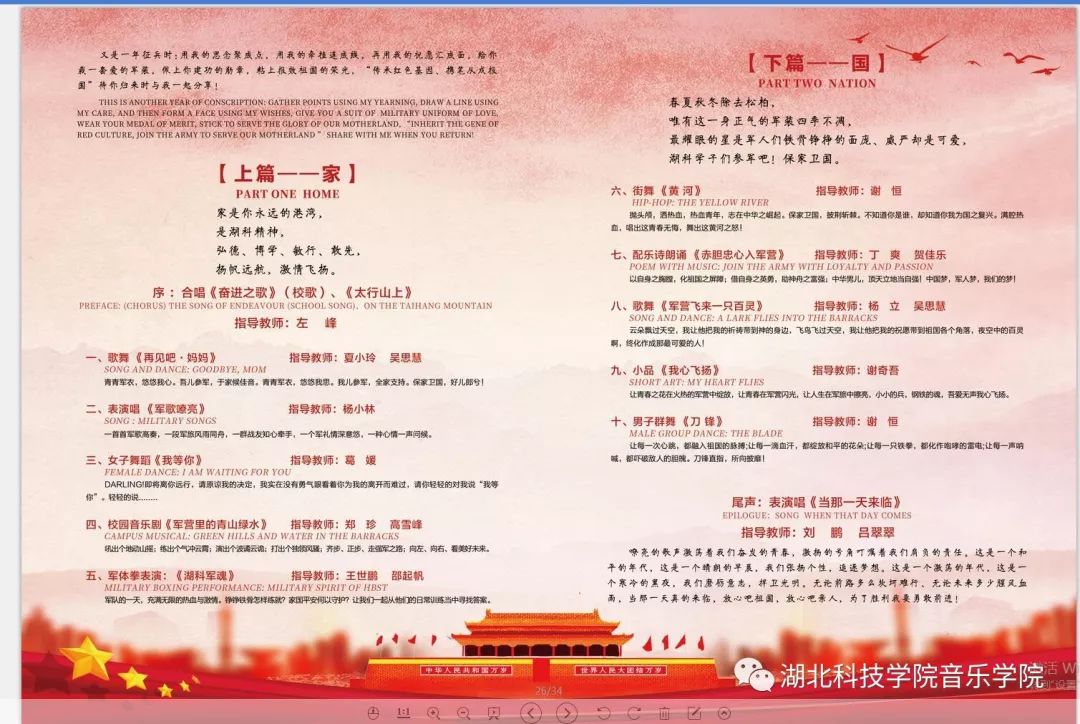 此次文藝匯演分為“家”和“國”兩部分,演職人員全部來自湖北科技學院的學生,演出采取歌曲、舞蹈、詩朗誦、情景劇等多種演繹形式,生動展現了湖科學生對火熱軍營的向往。
