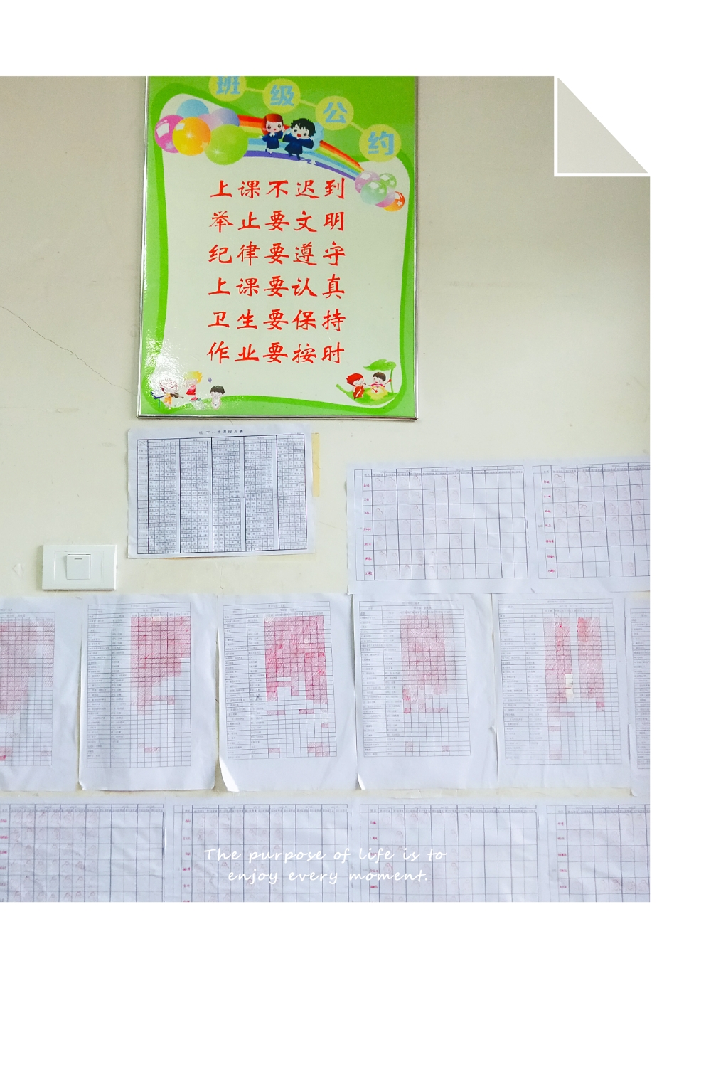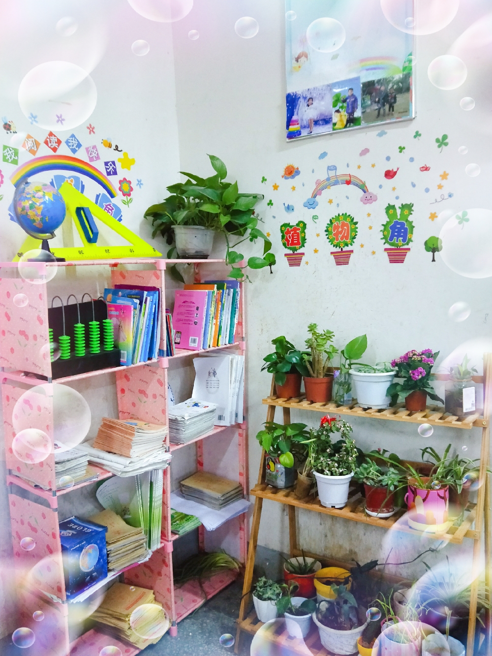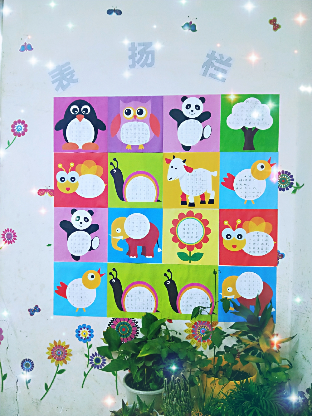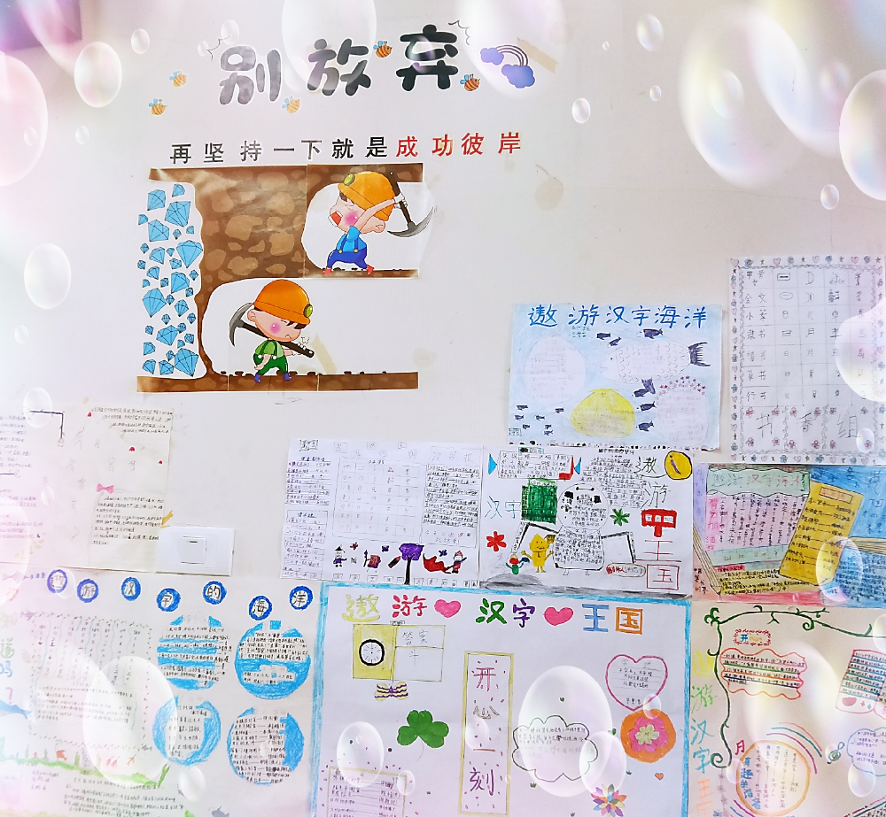 創建活動中,有的班級用學生手抄報和學生優秀作文布置班級的文化展板,有的用花草布置裝點講臺,有的用學生剪貼的圖案和藝術作品裝飾墻壁,有的用五顏六色的彩紙折成各種各樣精美的圖形掛在教室的四周,各班還配置了圖書架,建起了圖書角……