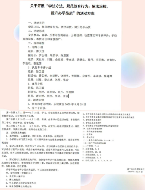 咸寧網訊:為進一步加強依法辦學力度,提升全體教職員工學法守法意識。從5月10日至25日,東方外校組織開展“學法守法,規范教育行為;依法治校,提升辦學品質”活動。