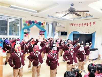 ??咸寧網訊?咸寧日報記者焦姣、通訊員李偲報道:“藍臉的竇爾敦盜御馬,紅臉的關公戰長沙……”4日下午,在市直屬機關幼兒園,戴著不同顏色京劇臉譜的大三班孩子們正伴隨著音樂聲進行表演,這是該園愛國主題環境創設中的一個環節。