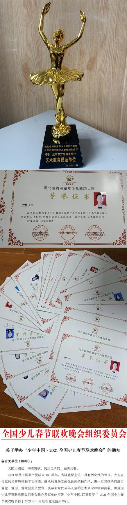 2020年12月19日,咸寧東方外國語學校舞蹈指導老師鐘靜帶隊參加“少年中國2021全國少兒春晚湖北選區”比賽,以98分榮獲特金獎同時入選2021全國少兒春節聯歡晚會。