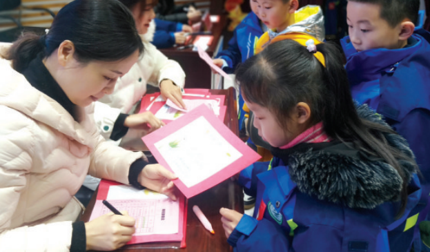 “來,排好隊”“小朋友,我們做個游戲可以嗎?”1月6日上午,咸安區(qū)外國語實驗小學一年級知識游園會正式開始。老師按照班級,給每個學生編號,大家胸前貼著號碼,在學術報告廳門口依次排隊,等待老師叫號入場。入場后的學生,在老師的引導下一一參加面試。