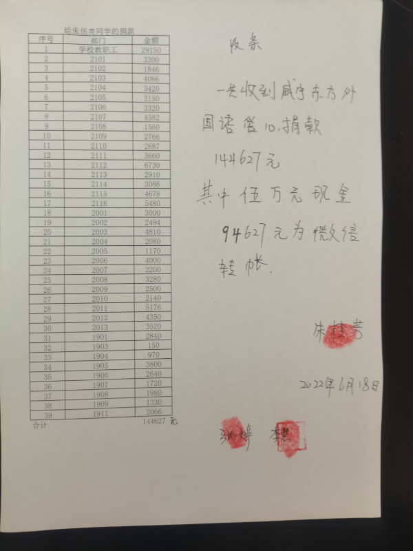 一方有難,八方支援,一生有難,全校相助。咸寧東方外國語學(xué)校在得知朱伍亮同學(xué)病情后,校團(tuán)委迅速組織獻(xiàn)愛心活動(dòng),號召全校師生、職工及家長,伸出援助之手,幫助朱伍亮同學(xué)渡過難關(guān)。短短兩天時(shí)間,咸寧東方外國語學(xué)校師生、員工及家長就為朱伍亮捐贈(zèng)善款144627元。