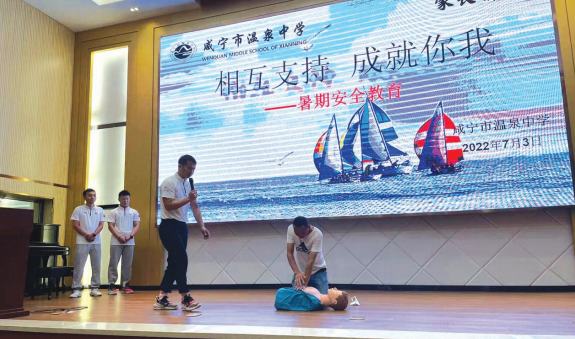 咸寧網訊(記者熊大平 通訊員傅祖斌)“‘拔草種樹’通過培養有益的興趣愛好占領孩子的時間,精心策劃,以身作則,家校合作,不斷進步。”近日,溫泉中學召開暑期安全教育活動,校安辦駱光輝老師的暑期生活建議分享,受到學生家長的好評。活動現場就暑期安全的相關事宜開展教育以及心肺復蘇的教學。