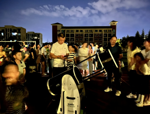 科普活動(dòng)結(jié)束后,學(xué)生隨張平老師來(lái)到了學(xué)校操場(chǎng)上。5臺(tái)望遠(yuǎn)鏡已被移到了這里,進(jìn)行調(diào)試后,學(xué)生和家長(zhǎng)們?cè)趯W(xué)校的老師引導(dǎo)下排起了長(zhǎng)龍,安全有序地用專業(yè)望遠(yuǎn)鏡觀看星星。現(xiàn)場(chǎng)活動(dòng)分為兩組同時(shí)開(kāi)展,一組觀測(cè)月球、英仙座流星雨、土星,另一組學(xué)習(xí)北斗星座標(biāo)識(shí)、尋找昴星團(tuán)。