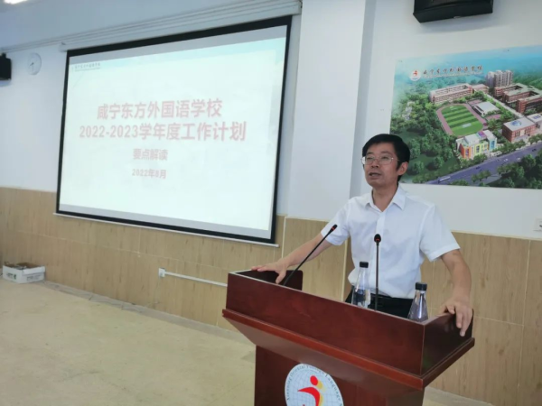 8月21日上午,黨支部書記、總校長韓冀就咸寧東方外國語學校2022-2023學年度工作計劃進行要點解讀。總校長韓冀強調,以習近平新時代中國特色社會主義思想、中共二十大會議精神為指南,全面貫徹落實黨的教育方針,尊重教育規律和青少年兒童成長規律,依法規范辦學,大力發展素質教育,扎實推進教育教學改革,全面提高教育質量和辦學水平,為實現全面轉型升級、打造受社會尊敬的東方智慧教育品牌而努力奮斗的指導思想。