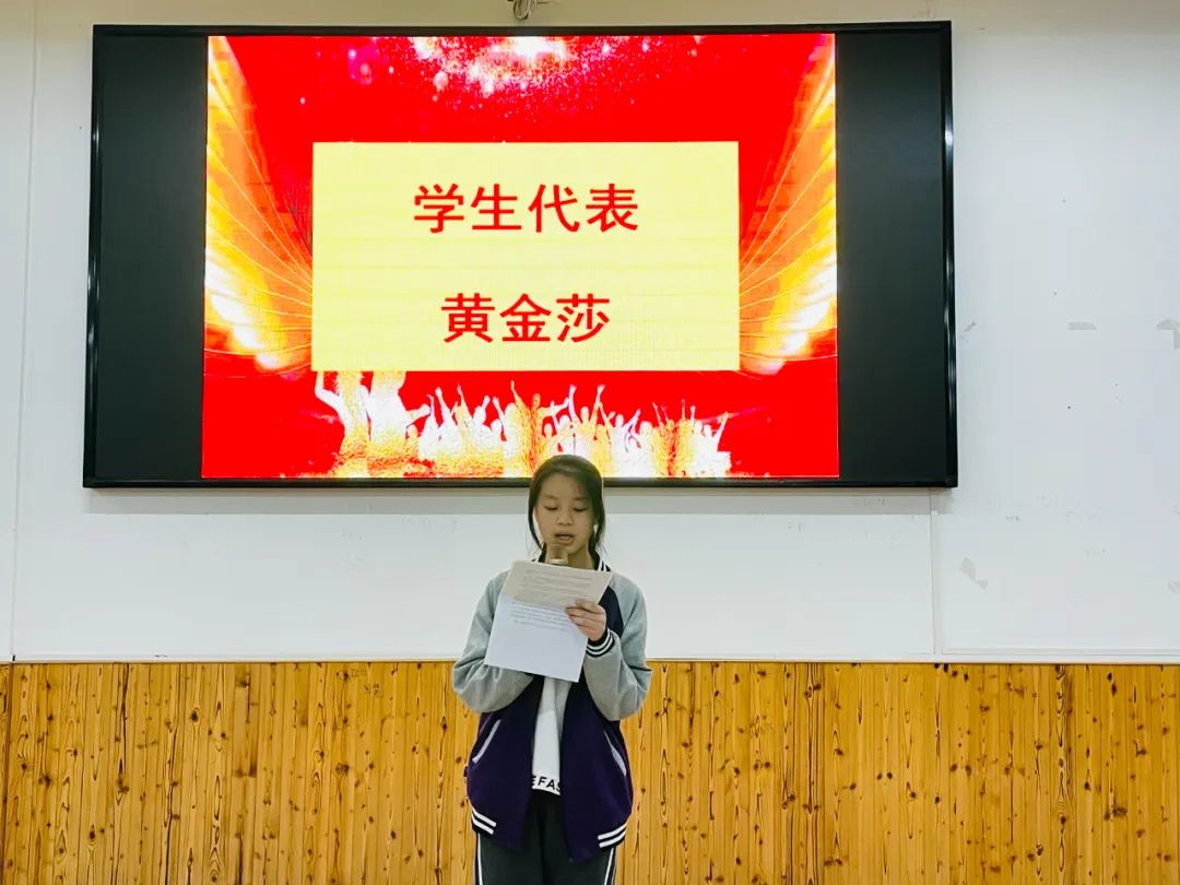 學(xué)生代表黃金莎同學(xué)發(fā)言,她表示將會在初三這一年努力奮斗,用青春書寫志氣,用辛勞書寫理想,用熱血書寫壯舉。