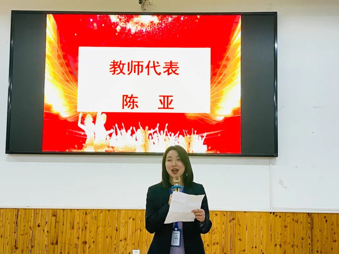 教師代表陳亞發(fā)言。她表示,初三年級全體教師將本著“對學(xué)生負(fù)責(zé)”的宗旨,以敬業(yè)務(wù)實(shí)的工作精神開拓進(jìn)取,立足于講臺,用靈動的智慧音符去彈奏學(xué)生的心靈之樂,用和煦的道德微風(fēng)去撫慰學(xué)生稚嫩的靈魂,力爭在新的學(xué)年里取得更大的成績。