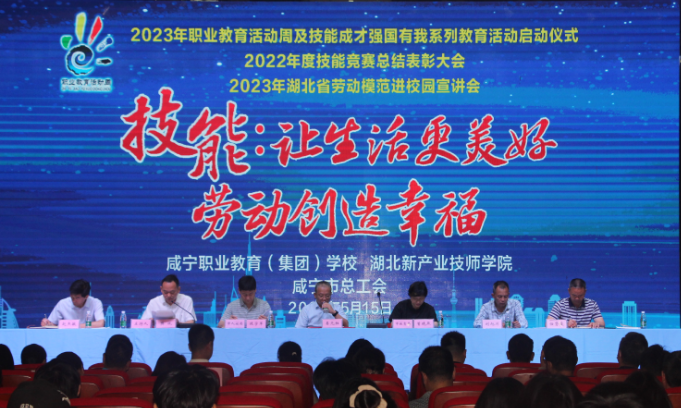 咸寧網訊?記者汪俊東 通訊員陳鏡斌 魯萬順?5月15日,湖北新產業技師學院 咸寧職業教育(集團)學校舉行2023年職業教育活動周及“技能成才,強國有我”系列教育活動啟動儀式,并對2022年度技能競賽獲獎選手進行表彰。來自市教育局、市人社局、企業代表及校領導,各處室、各系部負責人,教師代表,學生代表等共200人參加啟動儀式,校長易元紅出席,并致辭。
