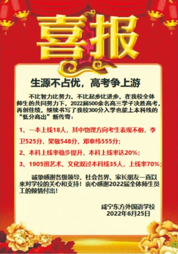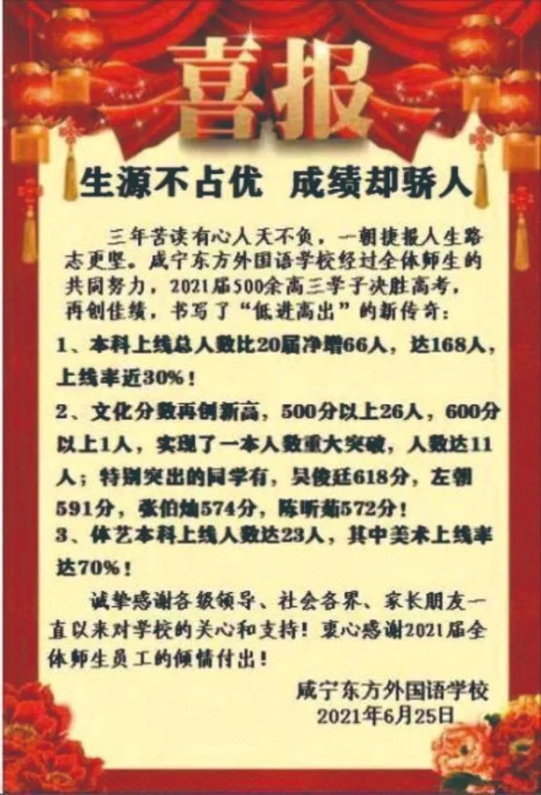 咸寧東方外國語學校,是一所咸寧市教育局直屬的十二年一貫制民辦學校,受咸寧市教育局直接管理,中考享受溫泉城區錄取政策。學校創辦于2003年,現有咸寧市高新區青龍路校區、咸寧溫泉桂花路校區兩個校區,校園占地面積100多畝,涵蓋幼兒園、小學部、初中部、高中部共88個教學班,在校師生3000多人,特級教師1人,正高級教師2人,高級教師17人,省、市、區級優秀教師35人。