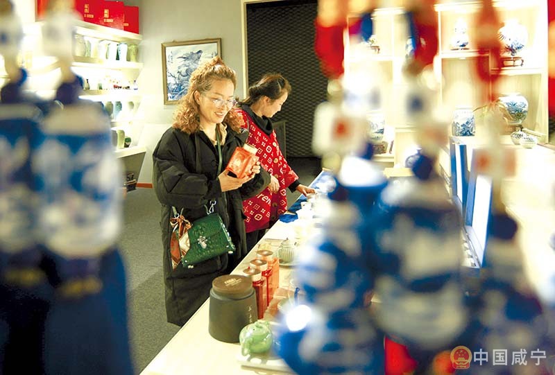 3月15日,崇陽縣經濟開發區湖北梓澤陶瓷有限公司產品展示銷售區,顧客在欣賞一件本土企業定制的陶瓷工藝品。