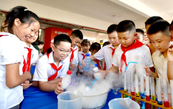當天,在咸寧市第二實驗小學校園里,機器人隨著音樂跳起了舞蹈;四足機械狗隨著操作,行走、爬坡、坐、立;化學小實驗、手工制作、少兒編程等科技體驗項目,處處散發著科技的魅力。