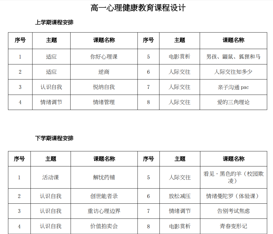 在課程設置方面,高一年級每兩周開設1節心理健康教育課。學校選用周宗奎主編的《心理健康教育》作為參考教材,根據中學生心理發展特點和規律,融知識性與趣味性為一體,結合教材主題,設計了我校心理健康教育的系列課程。