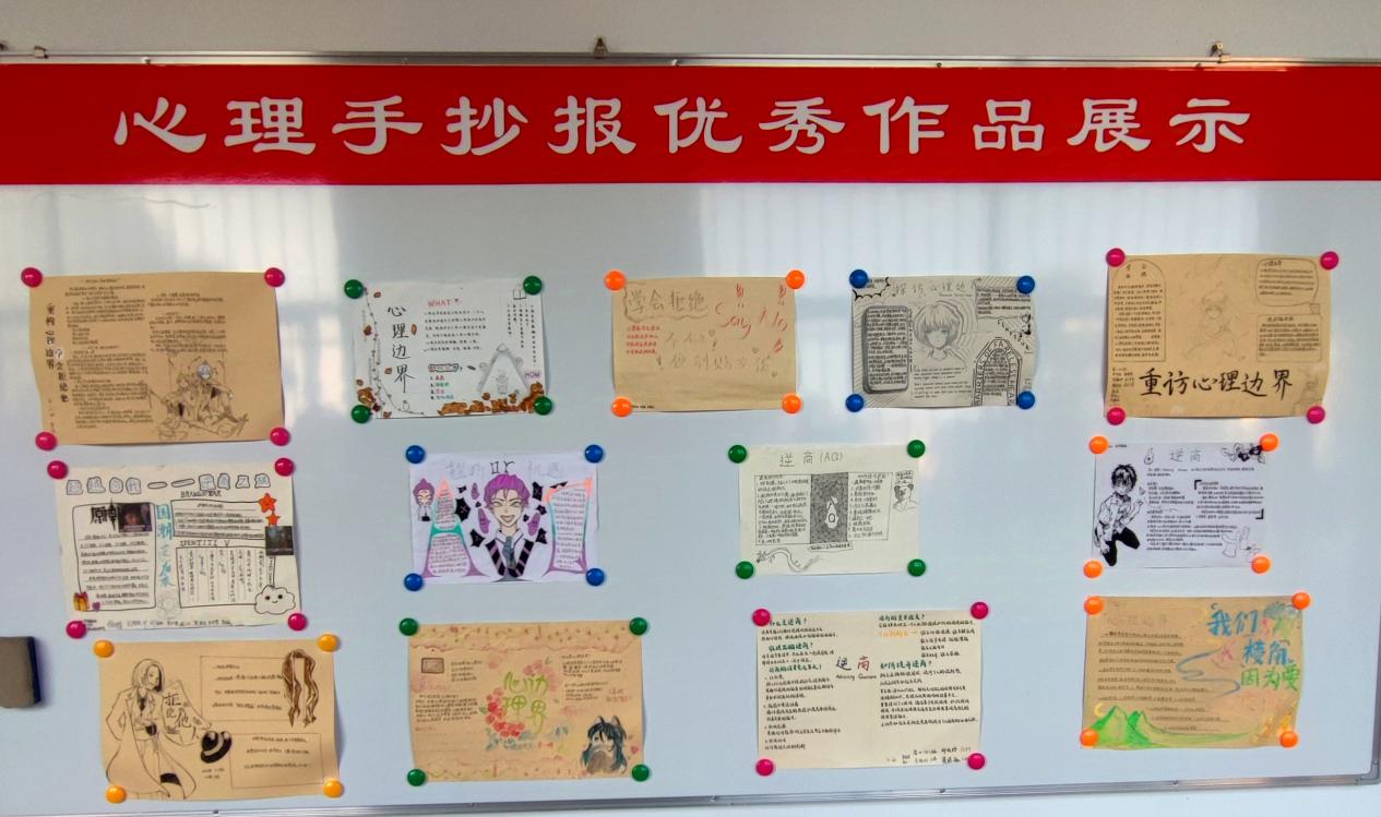 針對不同主題的心理課程,每學期學生需以小組合作的方式進行相關主題的手抄報制作。制作完成后,學校擇取其中的優秀作品在心理長廊作品墻上進行展示,以此更好吸引學生學習心理健康知識的興趣,激發學生參與活動的主動性與積極性。