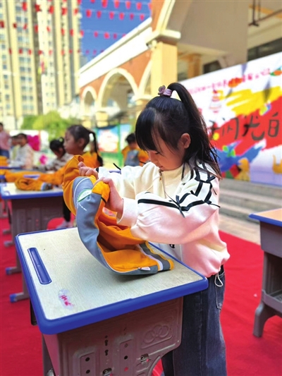室外的接力賽更是扣人心弦。五人一組的小團隊,每班三組依次接力沖鋒。穿衣服、疊衣服、扎頭發、穿鞋子(系鞋帶)、整理書包,這些看似平常的生活技能,此刻在孩子們的手中卻幻化成一場速度與規范的激烈角逐。他們全神貫注,爭分奪秒,那專注的神情仿佛在訴說著對勝利的渴望。用時短且規范的團隊,贏得了如雷般的掌聲與喝彩。