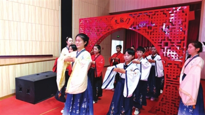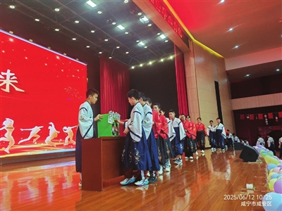 成童禮分六個環節進行,正衣肅容,學子們鄭重扶冠、理襟、整袖,在儀式中領悟“立身中正、胸懷坦蕩、行止有度”的立身之本;過文樞門,在班主任帶領下,學生們跨門告別懵懂童年,入門楣寓意誓做棟梁之材;沃盥凈手,旨在讓學生們通過凈手“明辨是非”、明確“擔當重任”;朱砂啟智環節,班主任老師、校領導一一為學生點朱砂,寄托智慧啟迪的愿景;擊鼓明志,校領導三擊洪鼓,帶領全場齊呼“正心修身!勤學篤行!振興中華!”鏗鏘誓言響徹云霄,家國情懷深植于心。感恩明誓,學子們禮拜師長,并以青春之名立下“以赤心報家國,以勤學開新境”的鏗鏘誓言。合唱《少年郎》的歌聲,飽含著大家對未來的無限憧憬與擔當。