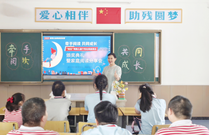 活動在溫馨的氛圍中拉開序幕。閱讀活動組織者雷會星老師以“牽手閱讀,共同成長:一場持續了四年的‘造光’工程”為主題,分享了從2021年至今陪伴特殊兒童閱讀的探索歷程。通過精心制作的PPT,大家共同回顧了四年來閱讀活動中的珍貴瞬間——從2022年班級圖書角的45本繪本起步,到發明“1分鐘親子共讀”;從2023年首次參與全國“牽手閱讀”活動,到今年發起“最美書桌”改造計劃。每一個畫面都記錄著閱讀為這些特殊孩子帶來的改變,見證著他們從懵懂到成長的蛻變歷程。