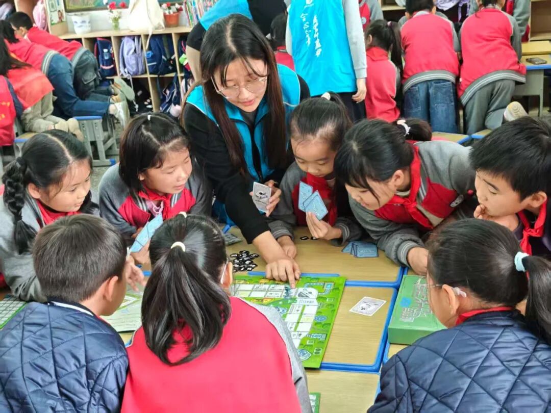 科普環(huán)節(jié)后,趣味桌面游戲環(huán)節(jié)拉開帷幕。志愿者們準備了“低碳出行家”游戲盒子,旨在強化低碳出行意識。老師細致示范游戲規(guī)則,確保每個步驟清晰易懂,并為每組安排志愿者老師輔助。孩子們迅速投入游戲,桌上五顏六色的卡牌中,低碳出行主題卡片仿佛一個個環(huán)保小夢想。游戲過程中,孩子們專注認真、合作分享,臉上洋溢著自豪的笑容,充分展現了對地球的祝福與對自然的熱愛。