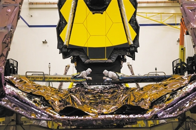 技術人員正在對韋伯太空望遠鏡的一個組件進行檢查