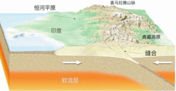 1985年,美國地球物理學家提出了衍生版俯沖模型大陸貫入說,該學說認為在青藏高原的下地殼存在著一種黏滯性很低的黏流體,剛性的印度板塊地殼向北貫入到軟弱的青藏高原低黏滯性的下地殼中,其動力機制就類似于液壓千斤頂的原理。在印度板塊貫入的壓力下,青藏高原隆起抬升。