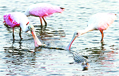 有一些動物雖然身材弱小,但卻敢于以弱擊強,堪 稱動物界的勇士。美國攝影師Phil Lanoue在他家附近 的鹽沼就拍到了這樣勇氣可嘉的一幕:一頭饑腸轆轆的 鱷魚遭到幾只琵鷺的挑釁,讓它倍感羞辱。這幾只琵鷺 似乎對鱷魚毫無畏懼,在池塘里跟著它,把它逼到角落 之后竟然還啄起它的尾巴來,這勇氣實在讓人欽佩。