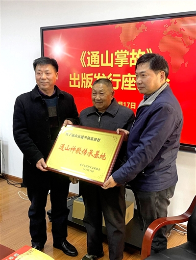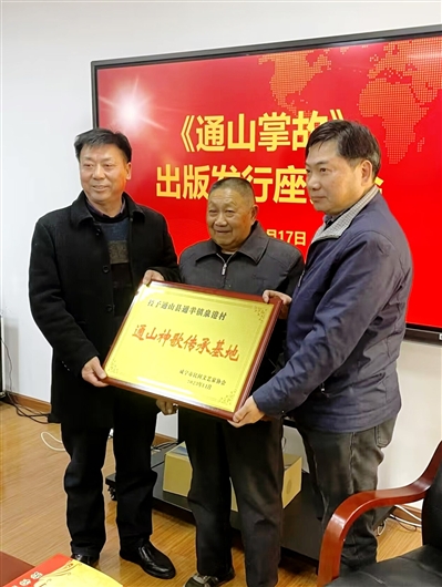 本報特約記者徐大發11月18日,咸寧市民間文藝家協會主席定光平將一塊“通山神歌傳承基地”的牌匾遞到通山縣通羊鎮泉港村神歌...