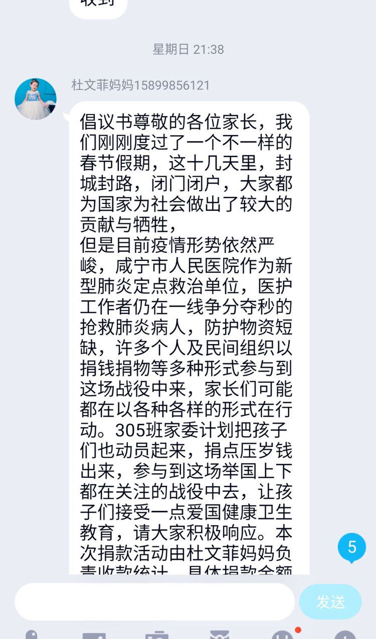 2月8日,在玉泉校區305班班主任的黃瓊老師的提議下,305班家委會在全班范圍內發起了捐款活動倡議書,倡議孩子們在自己的壓歲錢里拿出一部分,為咸寧市第一人民醫院(咸寧市新型冠狀病毒肺炎定點診療醫院)定向捐款。同時通過活動,動員家長向孩子們講解新型冠狀病毒的相關防治知識,講解一方有難,八方支援的愛國傳統,讓孩子們接受愛國教育和健康衛生教育。