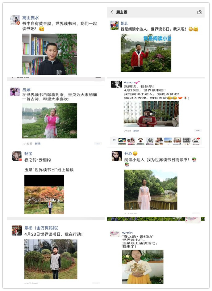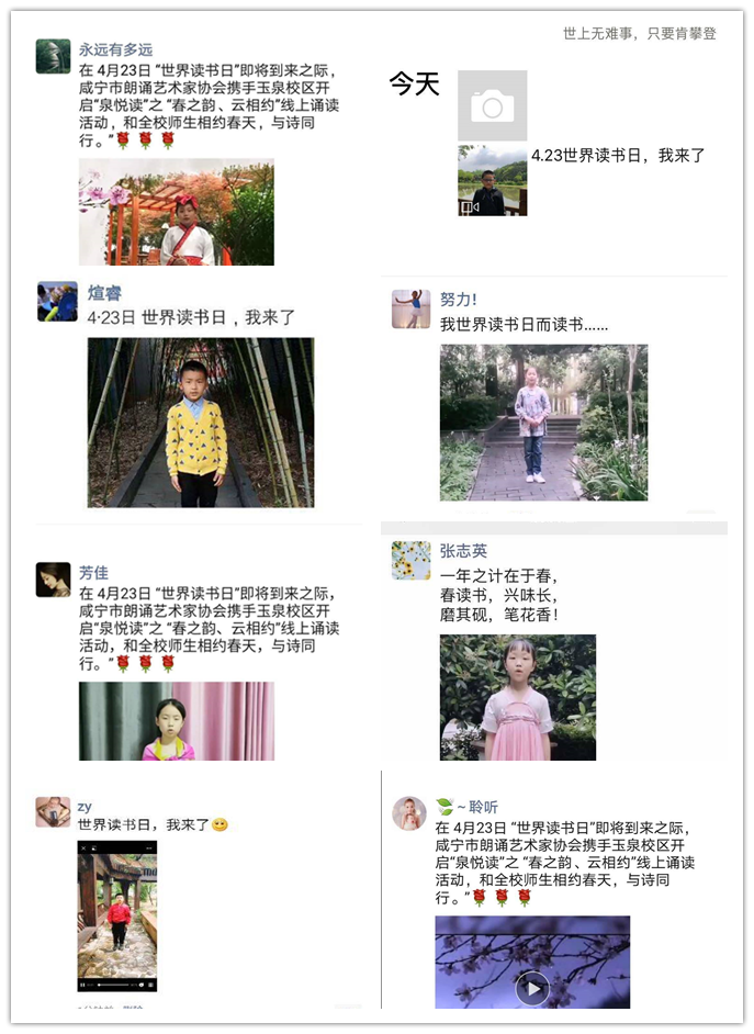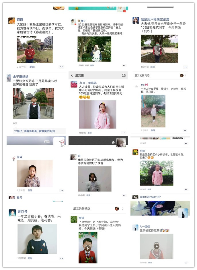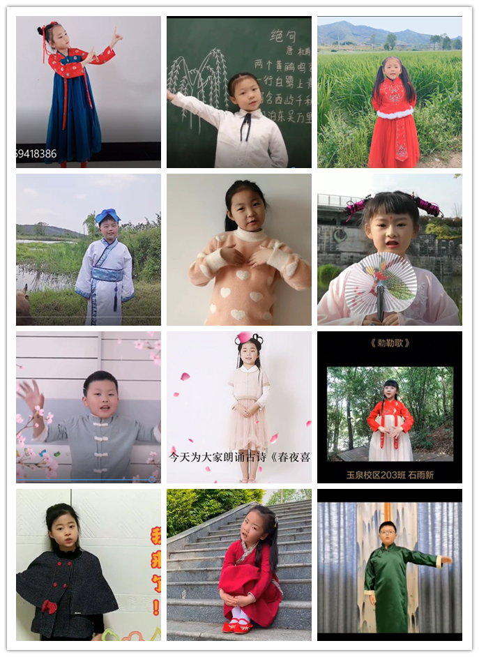 4月18至4月20日,玉泉校區(qū)的全體學(xué)生開啟云相約,通過拍攝短視頻的方式線上相聚,一起詠春誦春,此次誦讀的內(nèi)容是關(guān)于春天的詩歌。孩子們歡欣雀躍,一頭撲進春的懷抱中。有的身著漢服,來到春野,盡情享受古詩詞之韻;有的穿著美衣,流連花叢,真切感受詩人筆下春光之美……爸爸媽媽們則一舉變身編導(dǎo)、造型師、攝影師全程陪同孩子,用最好的狀態(tài)擁抱春天,用最美的聲音誦讀春天,匯成了一幅幅美麗動人的踏春圖!