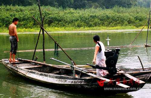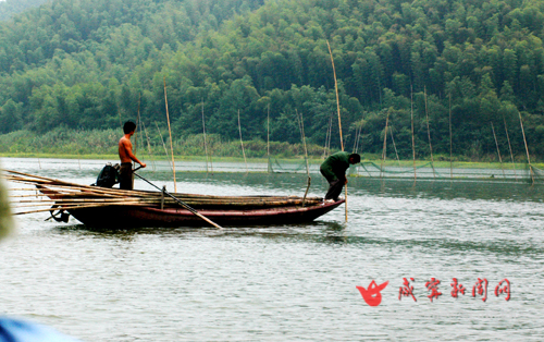 8月5日,崇陽縣青山風景區一批游人乘游艇在湖上飛舟。