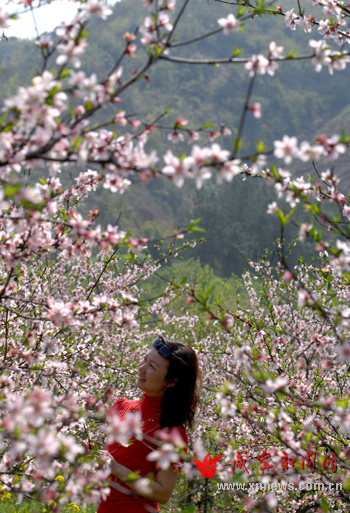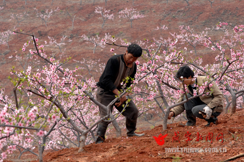 在花叢深處遇上正在剪枝、施肥的果農孫江林,他10年前就開始栽種桃果。他說今年雨水、氣溫都非常適合桃樹掛果,是個豐收的年份。走過一個田垅在花叢中又遇見正在除草的果農,聽見我們夸贊桃花、李花的美,她笑逐顏開:“花開得越艷,果就越多越好,好日子就越有盼頭了!”